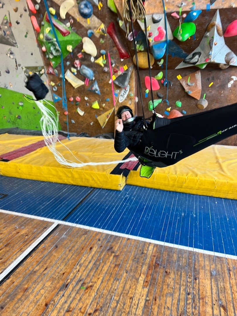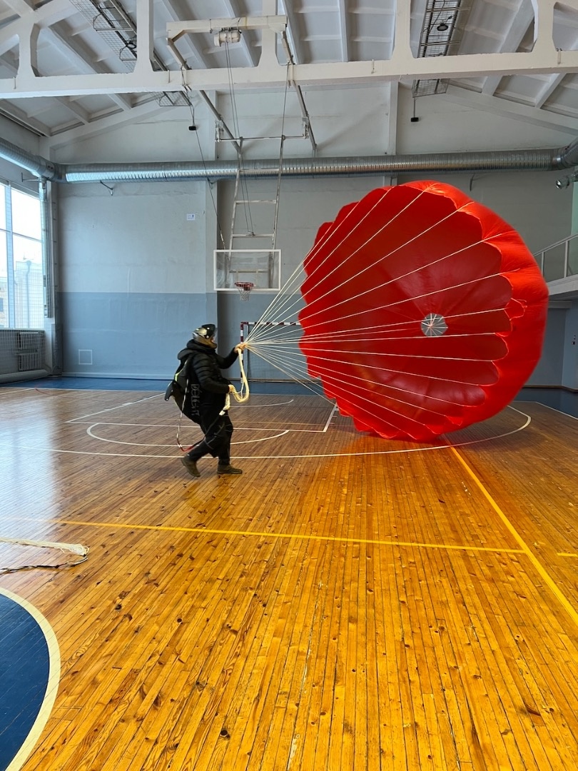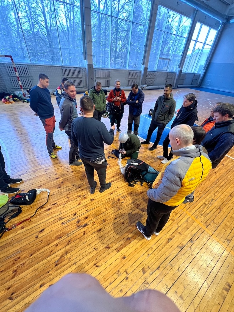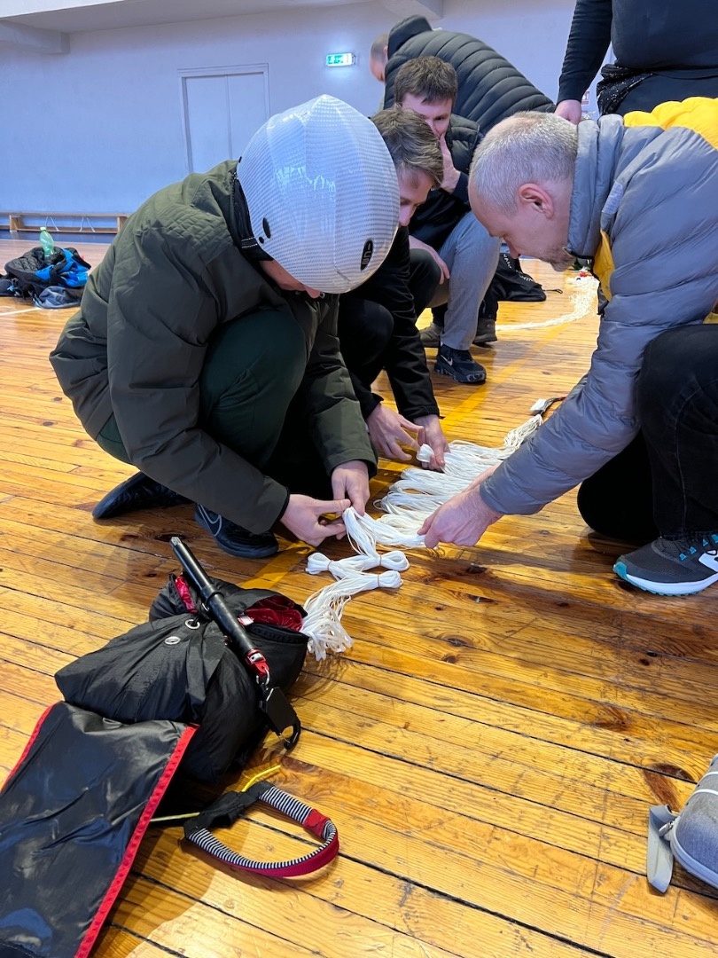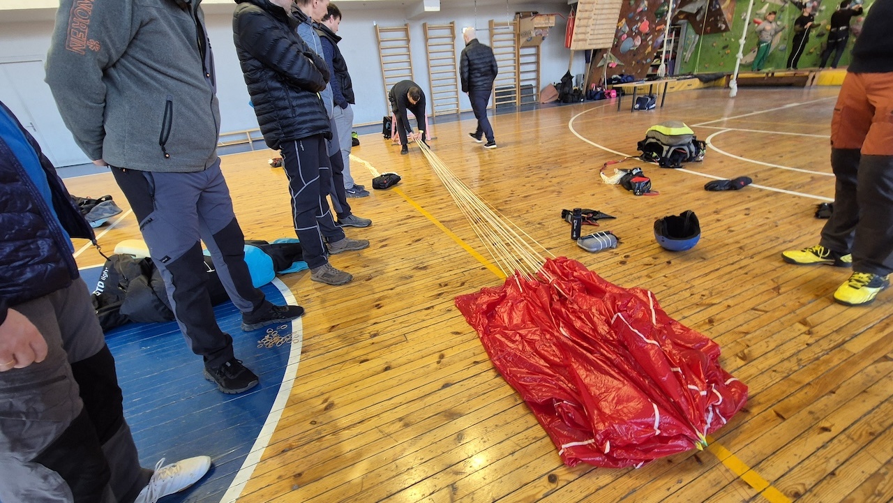 Aizvadījām praktisko nodarbību, kurā trenējām vienu no svarīgākajām drošības prasmēm paraplanierismā - rezerves izpletņa mešanu.
