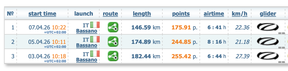 Piloti ar pieredzi arī bija atbraukuši vairumā uz Lieldienu brīvdienām - kopā stabili virs 30 pilotiem no Latvijas. Daži Lielmeistari, kā Aleksandrs Mihailovs arī uztaisīja trīs mega lidojumus virs 100 km, kas priekš Bassano Alpiem ir ļoti augsts sasniegums: